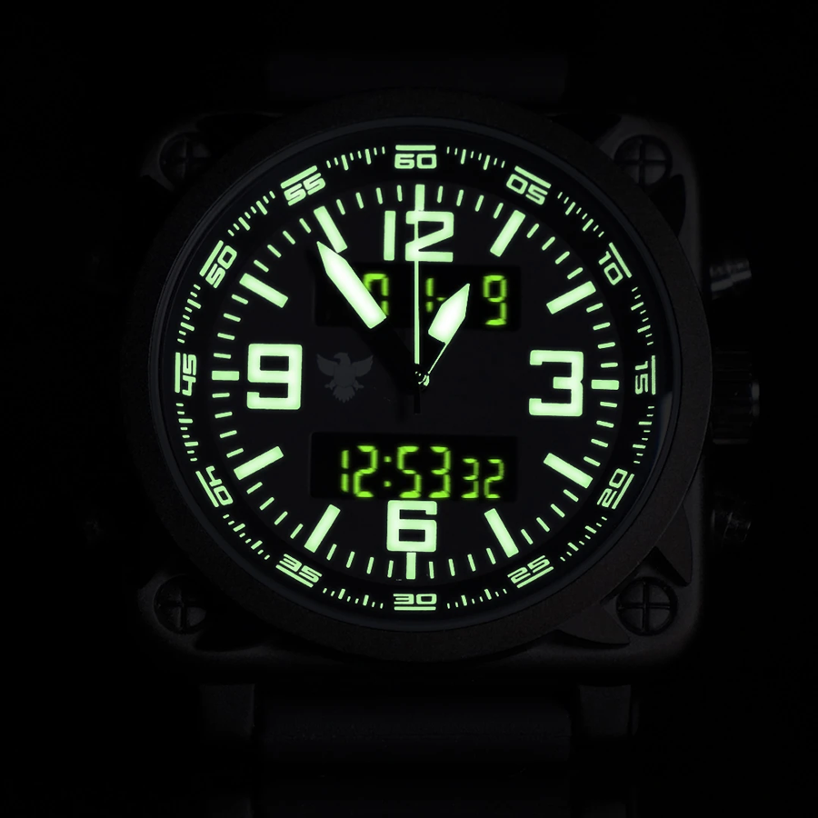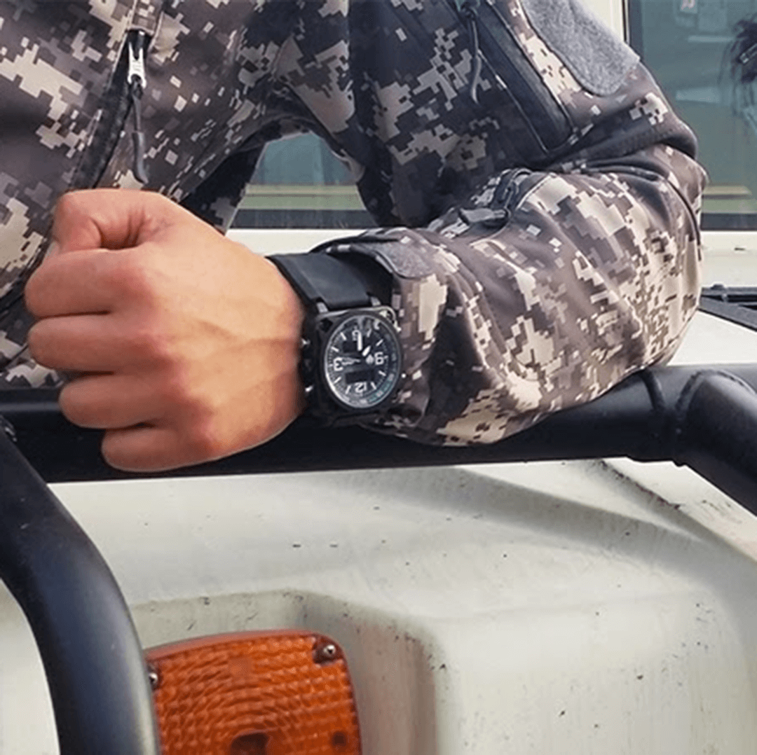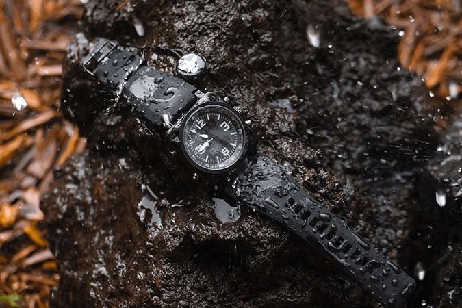 The M1000 Tactical Watch features a machined stainless steel body and sapphire crystal face. The thick black silicone band allows for rugged wear while maintaining a chiseled composition in any formal setting.